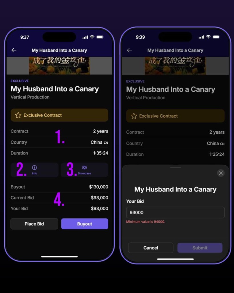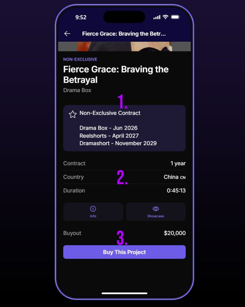Sell or buy the full rights to vertical films or series. Studios and platforms can acquire exclusive ownership and distribution, ensuring premium placement and audience reach. May the highest bid win!